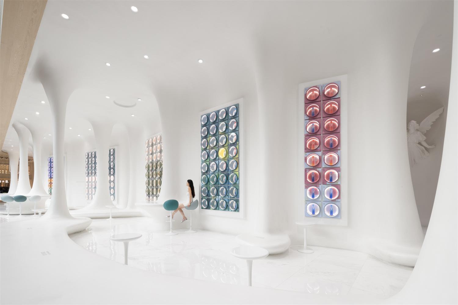 白墻上,一個個色彩漸變的取貨柜猶如拼圖塊,拼插為一幅幅方形畫作,難以取物的高處格口巧妙地作為隱蔽回風(fēng)口,或是單純陳列的窗口。色彩被分割,再以分離的筆觸織綴成畫。后退幾碼,漸變的色塊突然各得其所,凝結(jié)為閃爍生命力的花,畫作的印象方透過朦朧的肌理同光一起折射而來。團團的色彩如花朵在心底暈染,寂靜里綻開一個無限光輝的春天。