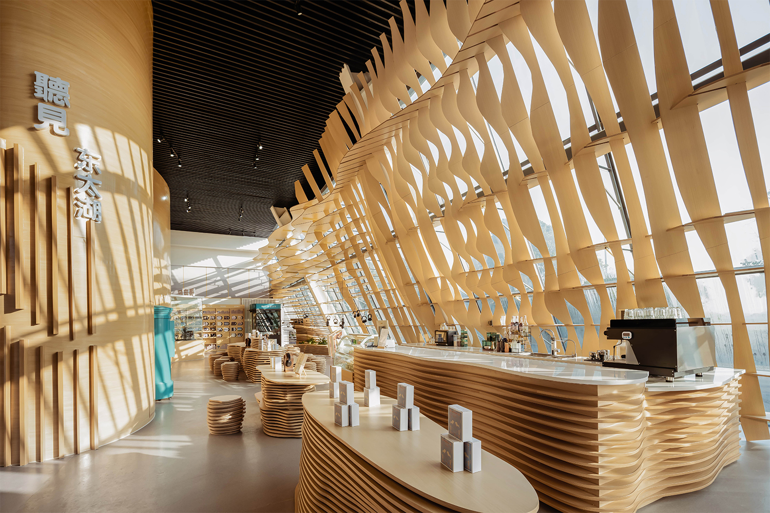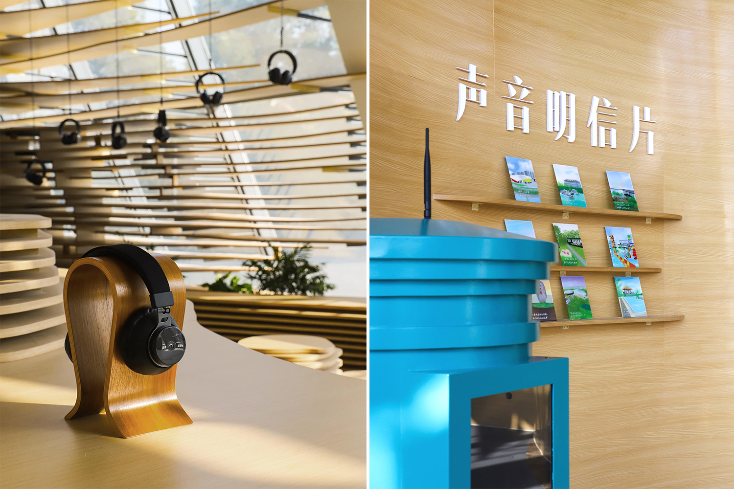 水流的元素貫穿了主廳的整體設計。設計師采用水流的形態將整個空間包覆,所有墻體都由漣漪型的格柵構成,在視覺方面讓游客們感受到回蕩在整個空間內的聲音。除此之外,富有流動感的墻面容納了“聲音明信片”、“聲音檔案館”、“聲音工作坊”等功能,靠窗一側的“耳機森林”、“文創展示”及“休閑座椅”等空間也是依據相同的理念設計而成。展廳內的座椅與展臺也都依托水流形態延伸而成,與墻面風格統一。