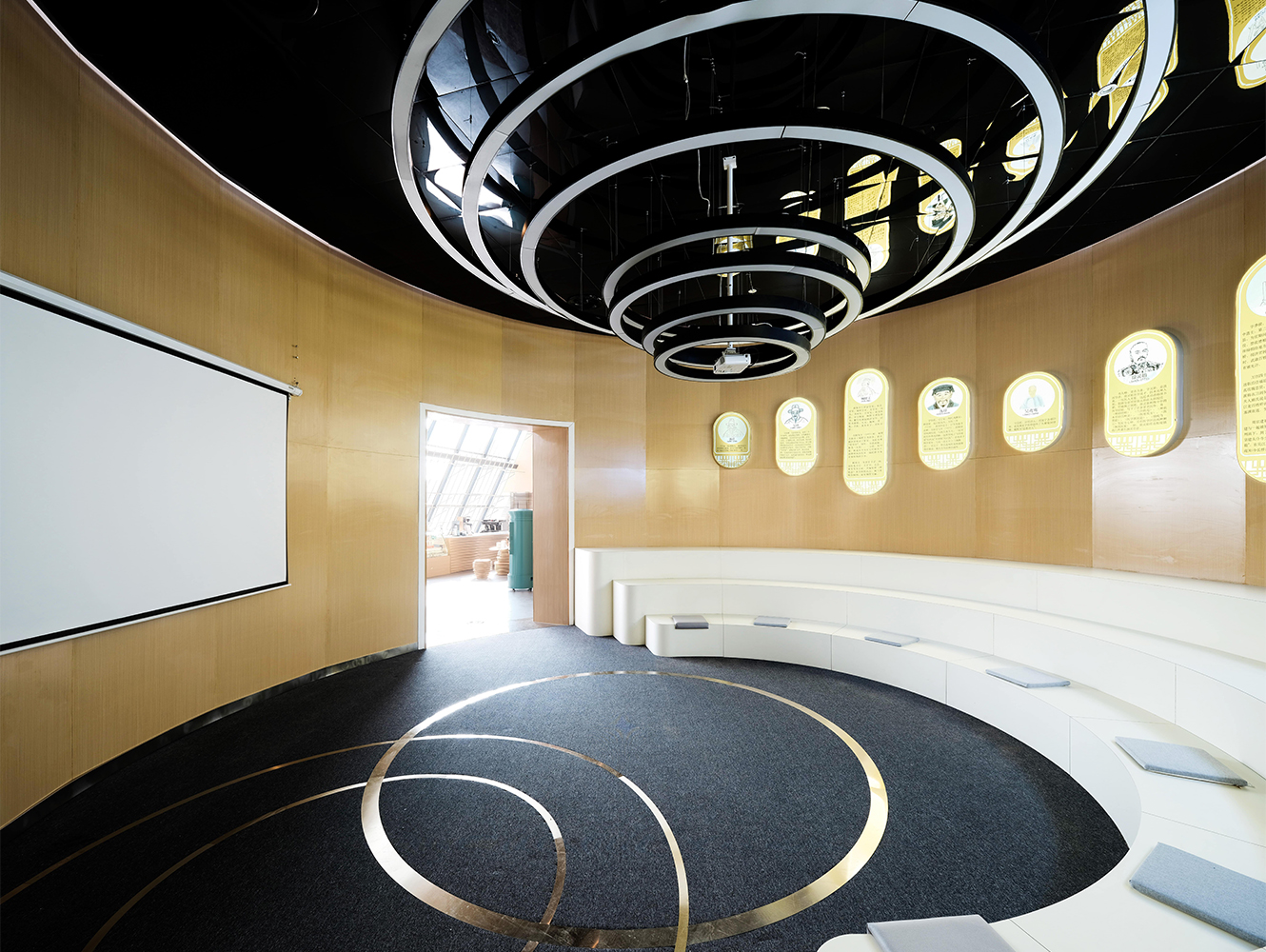 東太湖慧客廳整體風格以原木色為主,聲音流淌在木質紋路中,給人以溫暖、舒適的感覺?;劭蛷d的設計靈感則來源于太湖景區的代表元素:太湖水面泛起的漣漪與聲波十分相似,我們從中提取了圓形元素;而湖灣的整體外形又與水流的形態十分相似,我們從中提取了流動的概念,層層圓形與流動的線條相結合生成了整個展廳的空間。