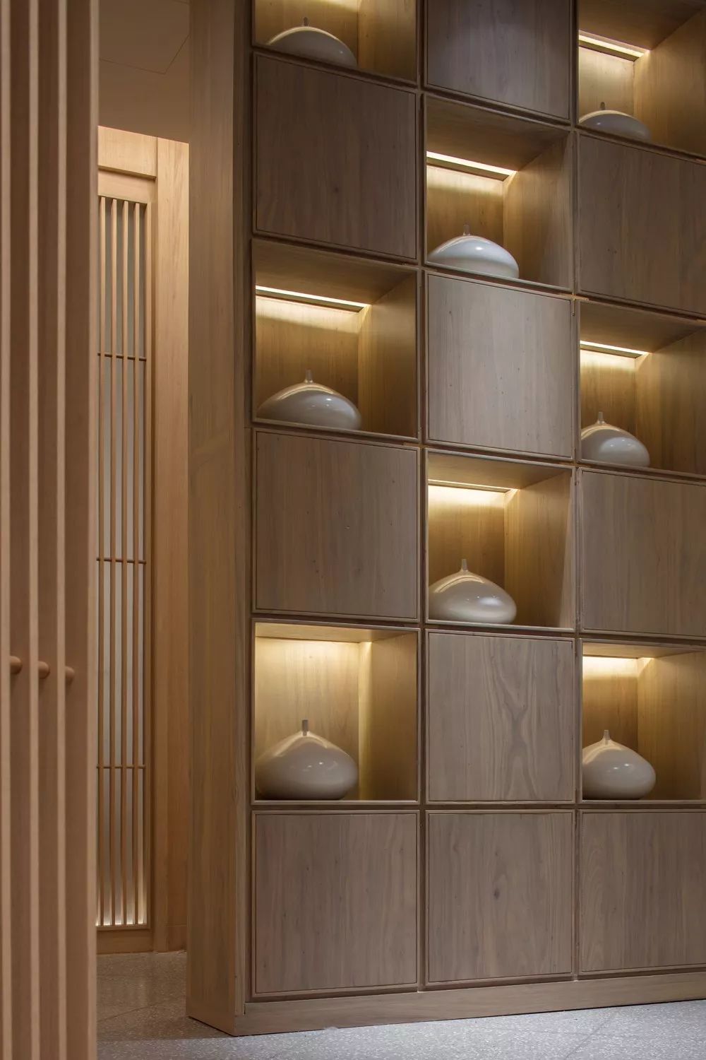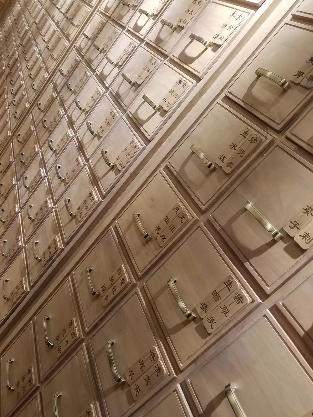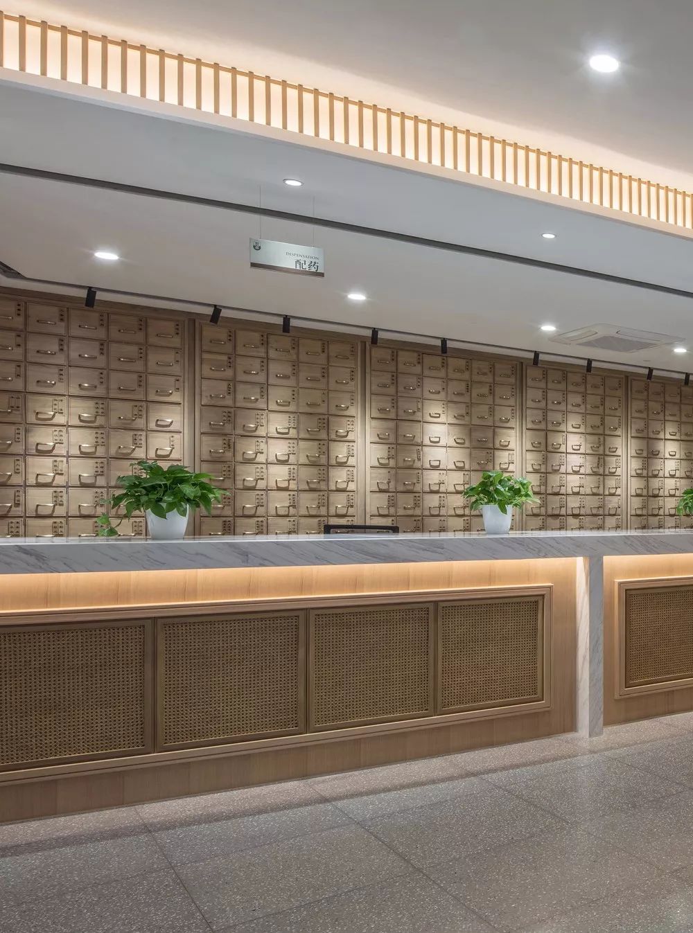 柜臺(tái)和存放藥材的百子柜,往往是一個(gè)醫(yī)館的核心,在本次設(shè)計(jì)中依然保留了傳統(tǒng)的醫(yī)館模式,貝聯(lián)珠貫的小抽屜呈現(xiàn)嚴(yán)謹(jǐn)?shù)闹刃蚋校跓艄庀蚂陟谏x。