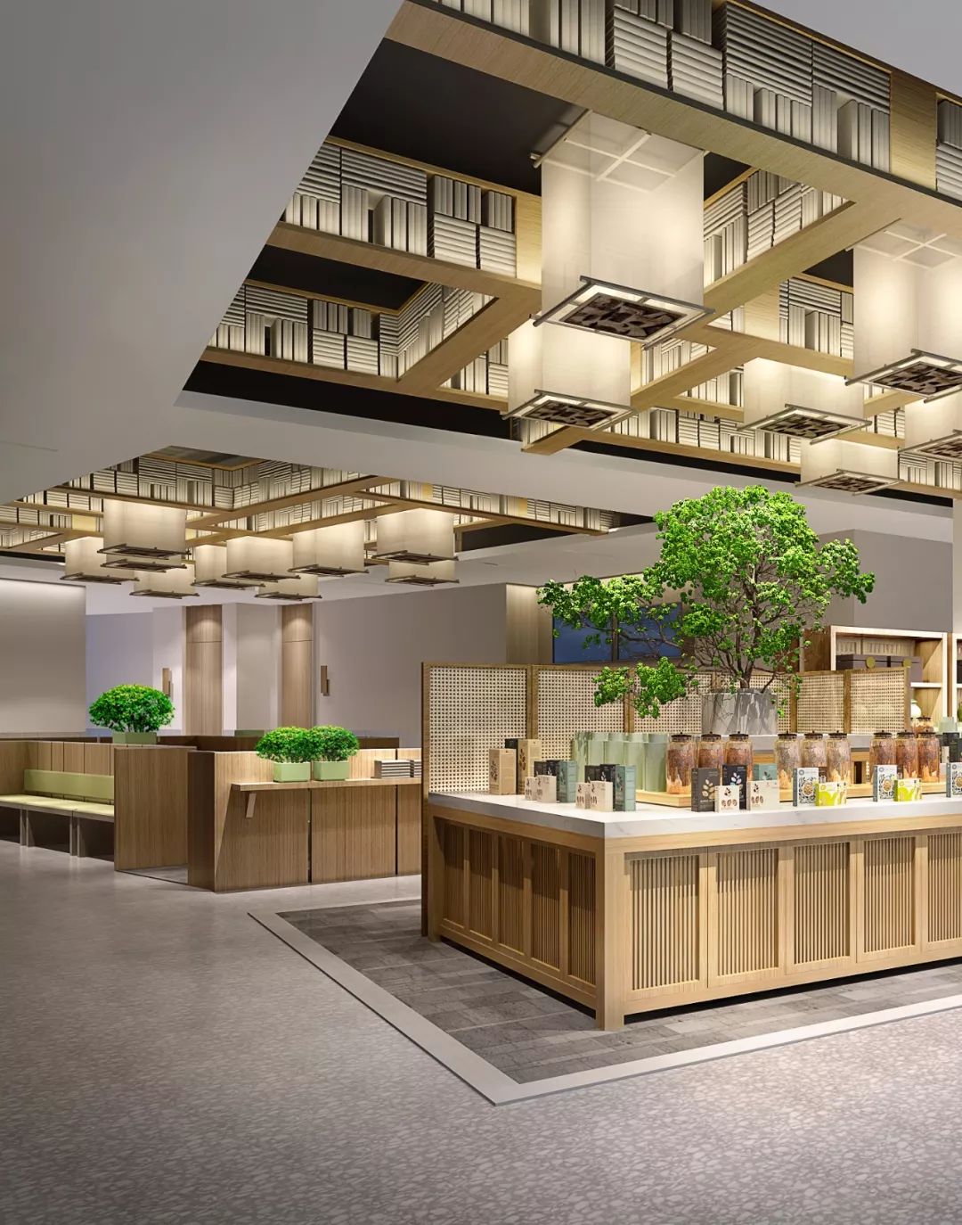 吊頂上燈飾錯(cuò)落,更顯視野開(kāi)闊空氣流動(dòng),窗明幾凈,不需要太多的神秘感,顯得更加開(kāi)放自然。實(shí)木和透光材質(zhì)的吊燈凸顯古風(fēng),但又滿足現(xiàn)代照明需求,傳遞了現(xiàn)代美學(xué)與傳統(tǒng)工藝有機(jī)碰撞。