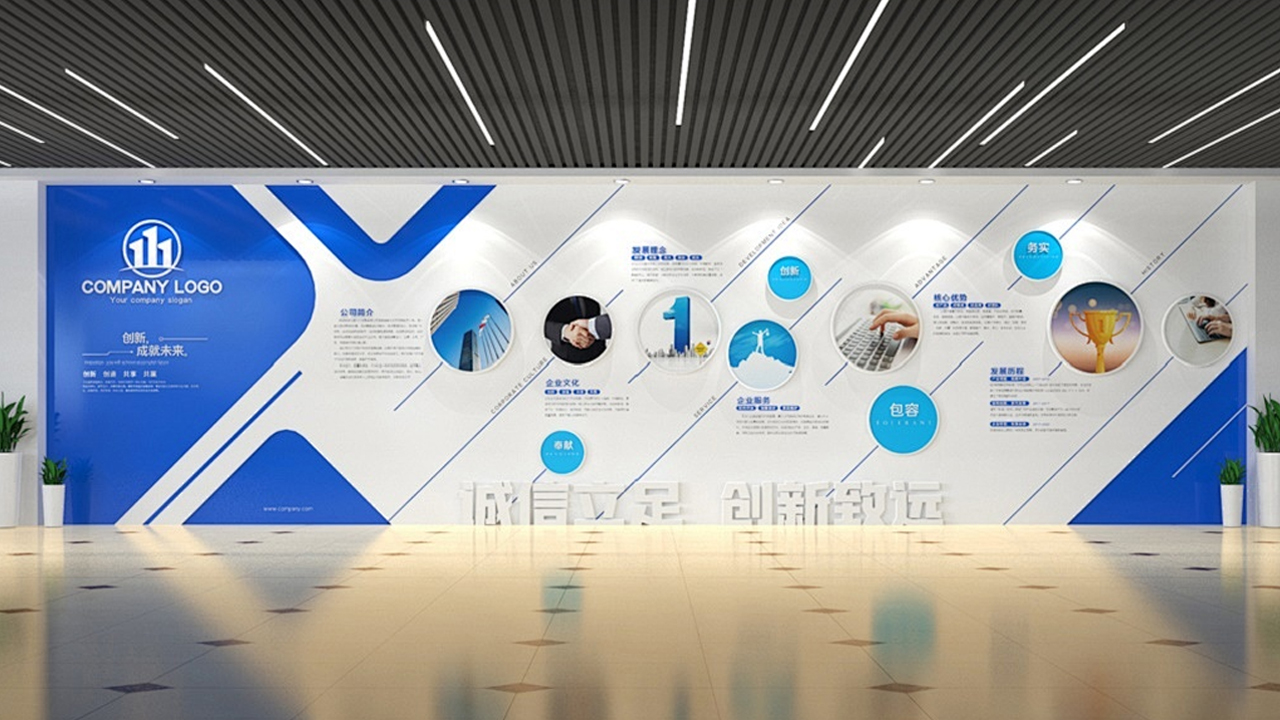 要做的文化墻顯大氣,整體版面盡量用亮膜PVC的材質(zhì)或者選用具有質(zhì)感的材質(zhì),造型簡(jiǎn)潔,復(fù)雜的造型短時(shí)間可以,長(zhǎng)時(shí)間就不太耐看。所以要采用簡(jiǎn)潔的造型,方形圓形、橢圓等來(lái)表現(xiàn)既簡(jiǎn)潔又大氣。在顏色運(yùn)用方面控制在三個(gè)顏色以內(nèi),國(guó)際的設(shè)計(jì)標(biāo)準(zhǔn)超過(guò)三種色人們?cè)趨⒂^的時(shí)候就會(huì)感到視覺(jué)疲勞。我們的文化墻使用來(lái)閱讀的,一定不能讓人感覺(jué)到疲倦。